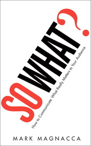 許多人一定曾經歷與他人溝通、推銷產品或說服他人的想法時,所得到回應卻是他完全不在乎的態度!這些人心理似乎異口同聲的說著:「So What? 那又怎樣?」。身為主動溝通者的我們唯有直到對對方能瞭解提供的產品或想法會帶來何種好處,才能算是成功達到溝通的目的。但這中間嘗試過程絕對不能僅用碰運氣的態度來猜測對方的想法就能過關的。最重要的是,我們要如何掌握及回應大部分人的So What?,瞭解這些So What?背後的原因,改變我們的溝通方式,讓所有被溝通者能感受到我們對他們的重視。